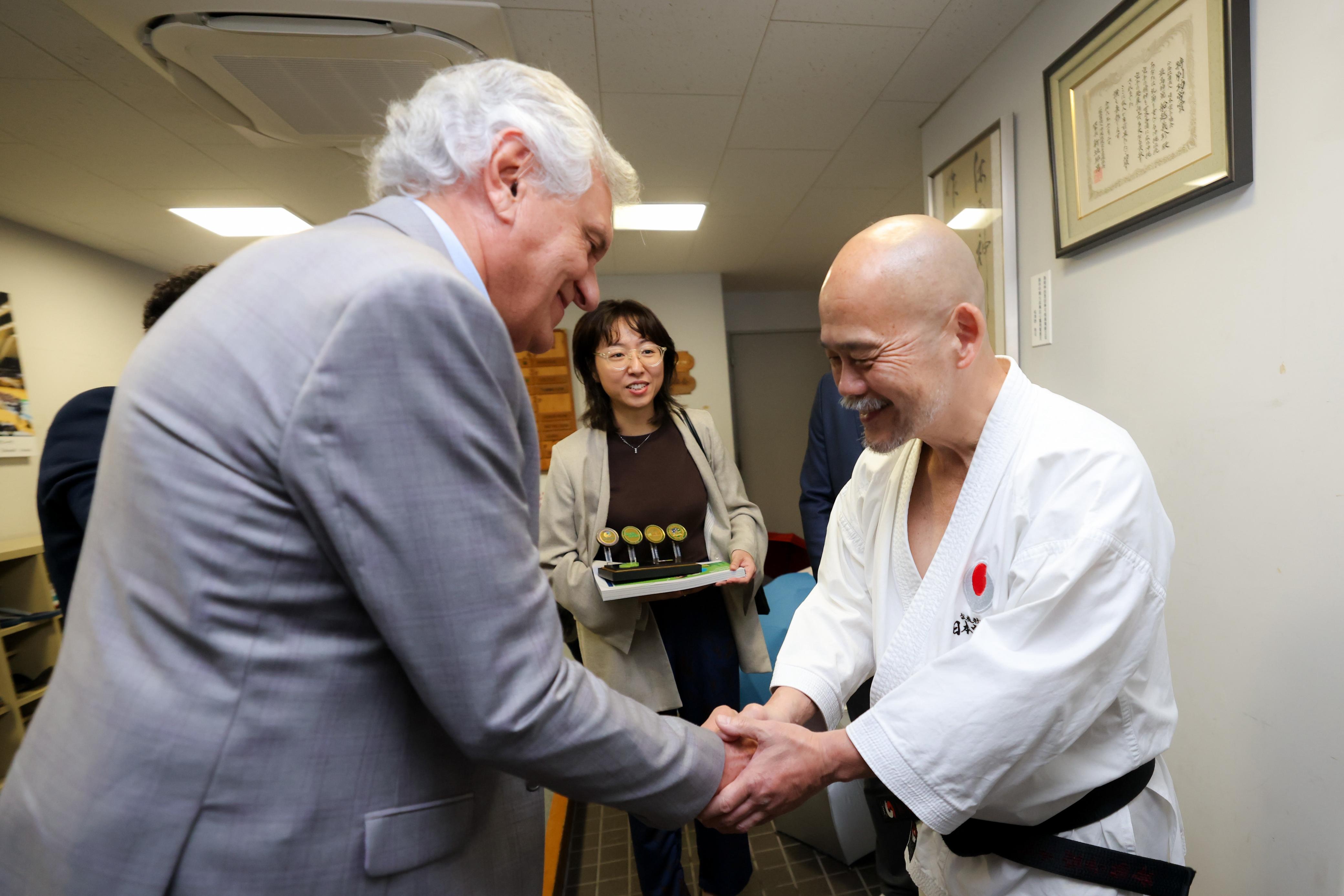 Na sede da JKA, a comitiva goiana foi recebida pelo segundo instrutor-chefe da JKA, sensei Seizo Izumiya, atualmente a segunda maior autoridade mundial do Karatê Shotokan. Izumiya agradeceu pela parceria e elogiou a iniciativa do Governo de Goiás, que conta com a participação do sensei Yoshizo Machida. Formado pela JKA, Machida coordena a formação pedagógica e esportiva do projeto Construindo Campeões. “Ele é o único oitavo Dan do Brasil”, destacou Izumiya.